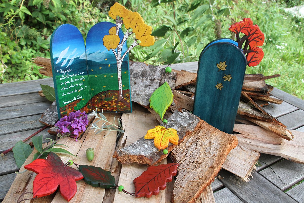 J’utilise du bois tendre (résineux, tilleuls…) et je peins mes objets à la peinture à l’huile (naturelle) ou l’acrylique.
